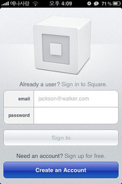앱스토어에서 내려받은 ‘스퀘어’용 앱 구동 초기화면.