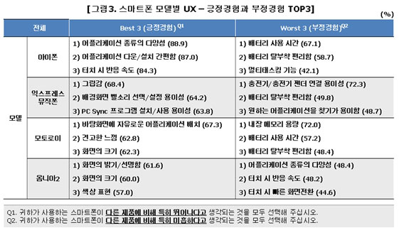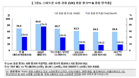 스마트폰 사용경험(UX; User eXperience)에서 ‘아이폰’이 압도적인 차이로 1위를 차지했고, 다음 ‘익스프레스뮤직폰’이 2위였다. 반면, ‘옴니아2’는 최하위에 머물러 외산에 대해 경쟁력을 갖추지 못한 것으로 조사됐다.