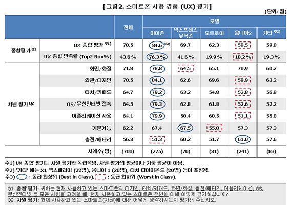 설문 대상자들에게 ‘화면/화질’ 등 7개 차원을 실제 사용하면서 어떻게 느꼈는지를 10점 만점으로 묻고, 그 다음 종합적으로 어떻게 평가하는지를 물어 100점 만점인 UX평가 점수로 삼았다.