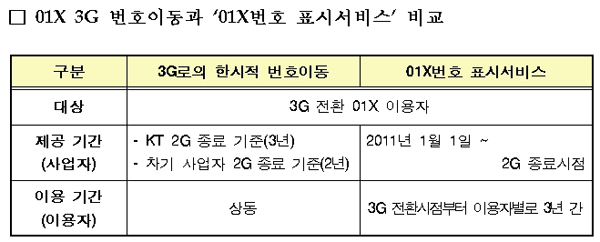 아울러 방통위는 이 기간, 01X 이용자들의 ‘3G로의 한시적 번호이동’과 ‘01X번호 표시서비스’를 허용했다. 이 서비스들은 2011년 1월 1일부터 시행되며, 01X이용자는 3G로 전환할 때 2개 서비스 중 하나를 택일해 사용할 수 있다.