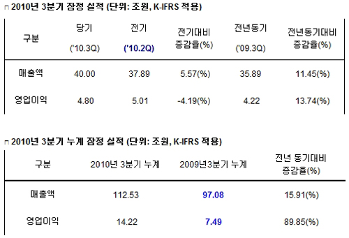 또한 3분기 누계로는 매출 112조 5300억원, 영업이익 14조 2200억원이 예상되며, 이는 전년 동기 대비 매출은 15.91%, 영업이익 89.85% 증가한 것이라고 회사측은 덧붙였다.
