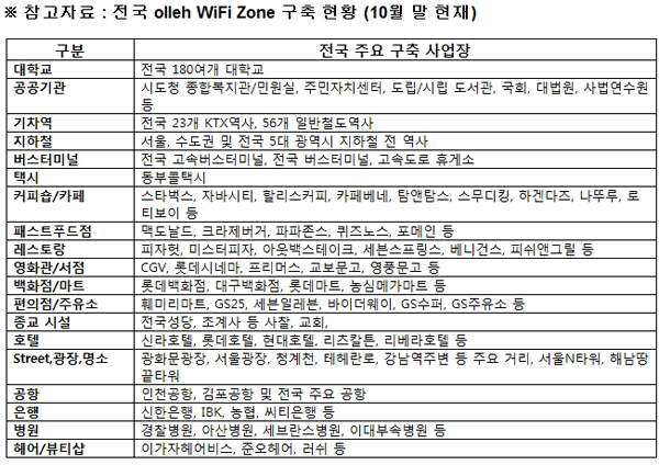 KT는 와이파이존이 늘어나면서 기존 서울/수도권 지역, 실내 고정 장소 중심으로 구축됐던 와이파이존이 다양한 장소로 확대되고 있다고 덧붙였다.