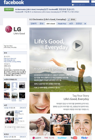 LG전자 페이스북은 기업소개, 브랜드, 기업문화 등 다양한 주제로 고객들과 대화하는 공간으로 활용할 예정이며 ‘담벼락’, ‘Life’s Good’ 등 고객들이 자유롭게 의견을 개진할 수 있도록 했다.