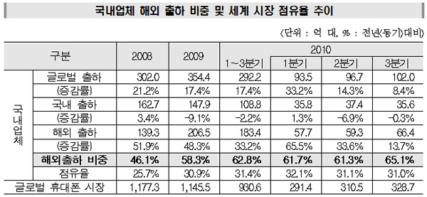 해외 출하 비중은 ’09년 58%에서 ’10년 3분기 누적으로 63%로 점차 확대되고 있어 이에 따른 수출 감소 효과도 발생할 것으로 지경부는 예상했다.