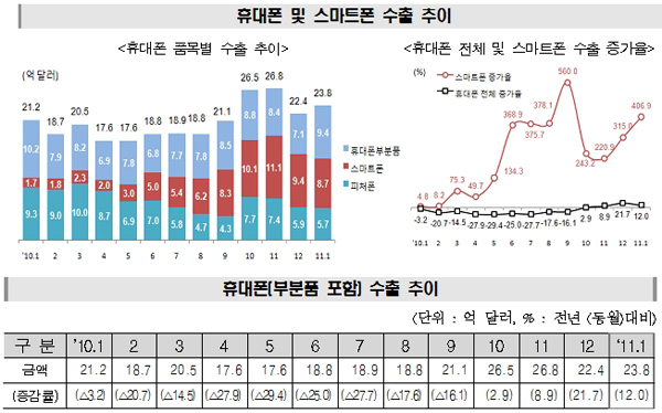 지식경제부가 8일 발표한 ‘2011년 1월 IT수출입동향’에 따르면, 지난 1월 휴대폰 수출액은 스마트폰 수출 증가에 힘입어 전년동월 대비 12% 증가한 23억 8000만달러를 기록했다.