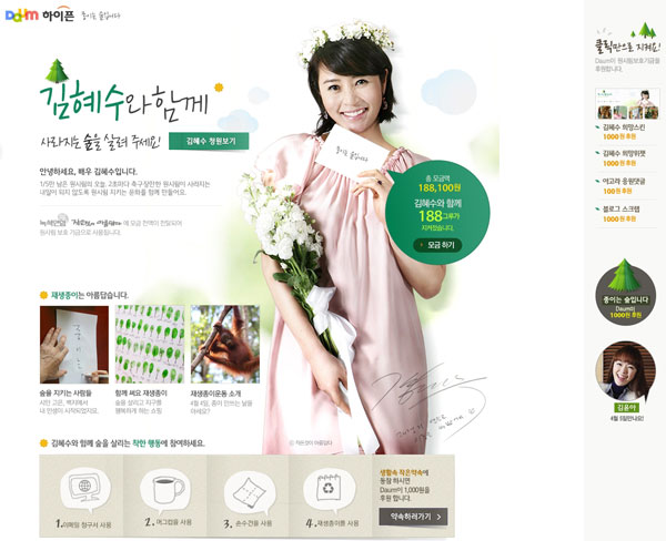 다음 육심나 사회공헌팀장은 “김혜수가 올린 숲을 살리기 위한 모금 청원글을 통해 네티즌들이 종이의 중요성을 느끼고 자발적으로 모금에 참여하고 있다”며, “앞으로도 다음과 스타, 네티즌이 함께 온라인 기부문화를 만들겠다”라고 말했다.