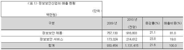 KISA 실태조사에 따르면, 2010년 전체 정보보안 시장 중 정보보안 제품부문은 전년대비 21.1% 성장한 9168억원, 정보보안 서비스부문은 약 23.8% 증가한 2146억원으로 집계됐다.