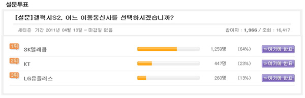 이번 ‘셀룰러톡’ 주제는 ‘갤럭시SⅡ’, 어느 이동통신사를 선택하시겠습니까’다. 국내 최대 모바일 포털 ‘세티즌(www.cetizen.com)’은 이를 두고 지난 13일부터 설문투표를 실시했으며, 21일 오후 4시 30분 현재 모두 1966명이 설문에 응했다.