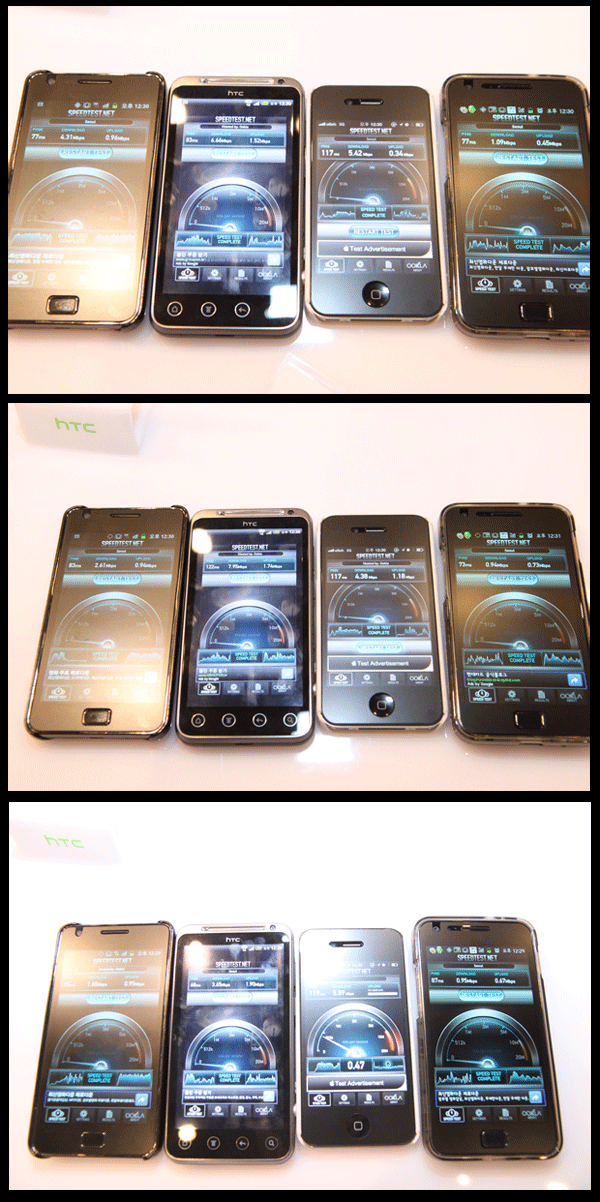 이날 실험에 이용한 폰은 SKT 3G 갤럭시S2, KT 4G 이보4G+, KT 3G 아이폰4, LGU+ 3G 갤럭시S2 이었다.