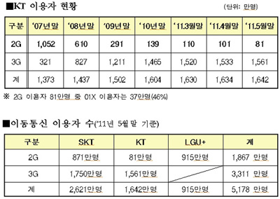 방통위와 KT에 따르면, 5월말 현재 KT의 2G 서비스 이용자 수는 81만명으로 KT 이동통신 전체 이용자수(1634만명)의 약 5% 수준이다. KT가 2G 폐지를 처음 공언한 3월말(110만명) 대비 30만명이 감소했다. 2G 이용자 81만명 중 01X 이용자는 37만명으로 46%에 달한다.