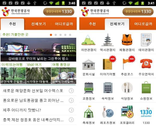 한국 관광공사에서 만든 애플리케이션으로, 약 3만 건 이상의 대한민국 명소와 관광지를 한눈에 확인할 수 있으며 역사, 체험, 테마 관광지 검색 및 지역교통정보와 숙박 및 식당, 쇼핑정보 등의 여러가지 카테고리로 묶여 검색하기 수월하다.