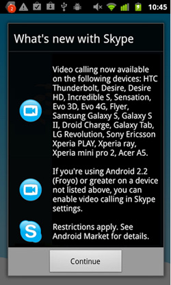 안드로이드용 스카이프의 영상통화 기능은 이전 업그레이드에서 지원됐지만, 당시 삼성 넥서스S, 소니에릭슨 엑스페리아 네오/프로, HTC 디자이어S 4기종 지원으로 제한됐다.