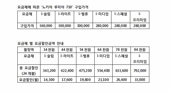 퀄컴의 1.4GHz 프로세서를 탑재한 ‘노키아 루미아 710’은 3.7인치 화면과 500만 화소 카메라를 제공하고, 색상은 블랙, 화이트 두 가지로 출시되며, 고객 취향에 맞게 바꿔 끼울 수 있는 다섯 가지 색상의 백 커버를 별도로 판매한다.