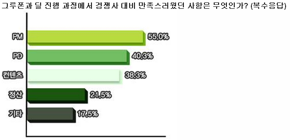 그루폰과 딜 진행 과정에서 경쟁사 대비 만족스러웠던 사항을 묻는 질문에는 절반이 넘는 55%의 응답자가 그루폰의 ‘파트너 매니저(PM, Partner Manager)’를 선택했으며, PD(40.3%), 딜 소개 콘텐츠(38.3%), 정산 시스템(21.5%) 등의 순으로 높은 점수를 줬다.?