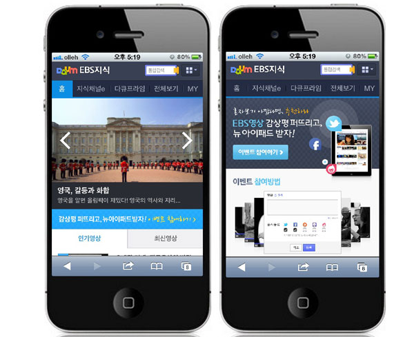 다음은 이러한 서비스의 장점을 활용해 오는 23일까지 ‘EBS 지식 모바일웹 오픈 기념 이벤트’를 진행한다. 혼자보기 아깝거나, 추천하고 싶은 동영상의 감상평을 작성해 SNS로 공유하면 추첨을 통해 뉴아이패드(3명)을 비롯해 5만원 외식상품권(30명), 영화예매권(50명) 등 푸짐한 경품을 제공한다.